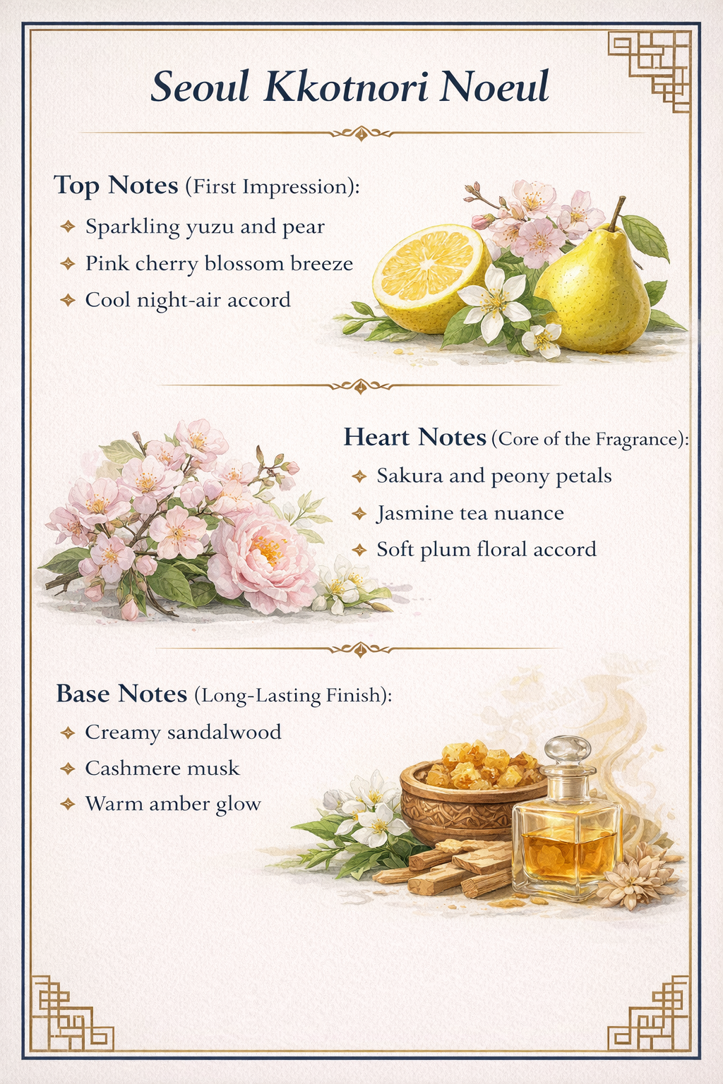 Encased in an elegant glass bottle with a deep navy label depicting Seoul’s traditional rooftops and tower, Seoul Kkotnori Noeul reflects modern romance—where heritage and neon lights meet. Each spray feels like strolling under blooming sakura with city lights shimmering in the distance, leaving behind a luminous, long-lasting trail.